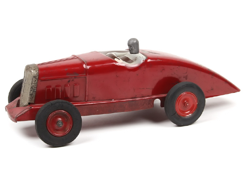 longueur 32 cm - avec moteur à clef (manquant) & direction - tête, petites fixations & essieu arrière non d'origine (roues repeintes avec quelques petits éléments) - décorations sur l'arrière de la carrosserie en grande partie effacées - calandre ternie - rayures & frottements plus ou moins importants sur l'ensemble de la carrosserie - pneus séchés & craquelés