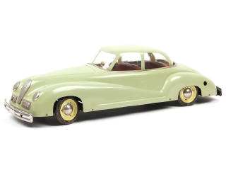 réalisation en tôle & bois - longueur : 41 cm - avec moteur à clef (fonctionne) & direction - en action, la voiture avance & recule grace à l'action de ses pare-chocs mobiles - petits manques de peinture sur l'intérieur des jantes arrière - SUPERBE !
