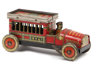 fait office de boîte à bonbons - longueuer : 17,5 cm - moteur à ressort (fonctionne) - extrémités d'axes de roues & une petite partie d'intérieur de toit ouvrant restaurées - quelques parties plus ou moins ternies & légèrement tachées