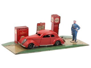 dimensions : 24 X 12 X 8,5 cm - avec colonne équipé d'un mécanisme permettant de remonter le moteur de la voiture (avec porte ouvrante), coupé en tôle (longueur 14 cm, moteur à clef fonctionne) & un personnage en plomb creux (état 'D' non d'origine) - tuyaux séchés & incomplets - fixation de panneau non d'origine