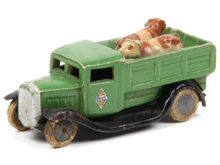 réalisation en plâtre & farine - longueur : 9,5 cm - avec 2 vaches - le châssis est en état 'D' (traces d'oxydation) - pneus endommagés & non d'origine - frottements plus ou moins importants par endroits avec quelques manques de matière