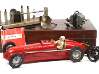 longueur : 42 cm - avec moteur thermique (non testé), direction, télécommande (parties cassées à l'intérieur, avec câble), appareil de mise en marche du moteur, transformateur, notice & un entonnoir - manque quelques petits accessoires (notamment fiole) - présenté dans un coffret en bois (dimensions : 52,5 x 32,5 x 12 cm) - traces de graisse séchée par endroits - SUPERBE !
