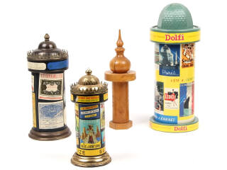 états de 'A' à 'B' - dimensions : 23 à 35 cm - comprend : tire-bouchon en bois (SOCIETE DES COLONNES AFFICHES), grand huilier en laiton (avec boite à musique qui fonctionne - métal terni), distributeur de cigarettes 'LOTERIE NATIONALE' en métal (terni) & range-bouteille DOLFI en plastique & carton