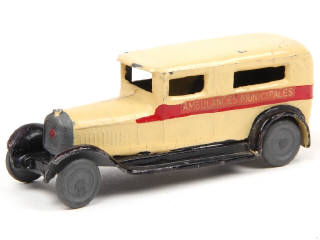 réalisation en plomb - manque fanion - fixations de châssis plus ou moins restaurées - châssis retouché - coulures de peinture d'origine à l'intérireur de la carrosserie