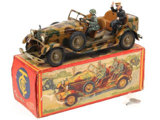 longueur : 23 cm - avec moteur à clef (fonctionne) & direction - avec un soldat (avec craquelures par endroits) & Adolf Hitler (non d'origine) - boîte restaurée avec parties non d'origine - pneus plus ou moins séchés
