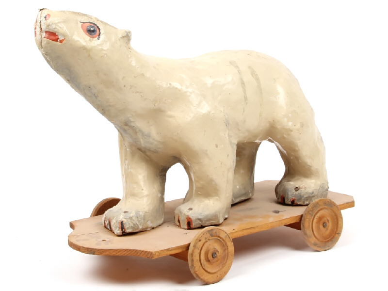 dimensions : 46 X 21 X 35 cm - jouet à traîner réalisé en composition sur socle en bois mobile (quelques fêlures) - quelques manques de peinture par endroits (notamment sur la tête)