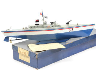 longueur : 65 cm - moteur à piles (non testé) - une antenne de mât déformée - boîte plus ou moins décolorée (avec notice tachée)
