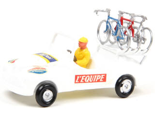 publicités 'L'EQUIPE, KASKOL & LE PARISIEN' - avec conducteur & 3 vélos - traces de colle d'origine sous le décalque de capot