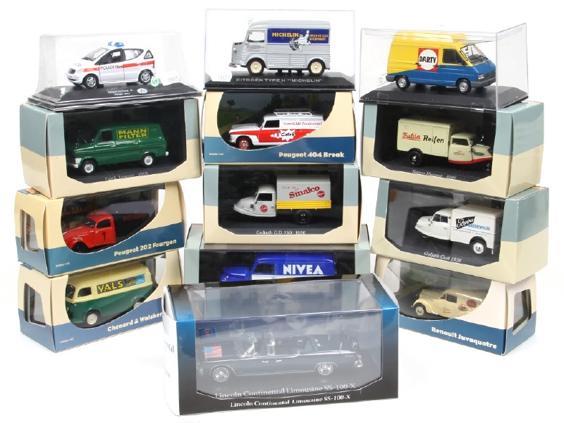 miniatures reproduisant notamment les modèles : PEUGEOT, CITROËN, MERCEDES, FORD & LINCOLN 'assassinat de KENNEDY'