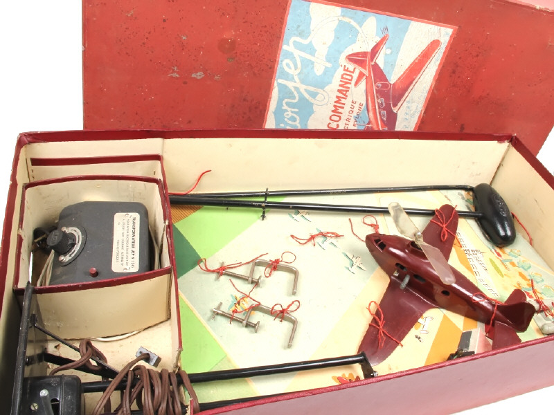 dimensions du coffret : 70 X 34 cm - mécanismes non testés : contient : un avion monomoteur en bakelite, un transformateur, un mât, une tige avec contrepoids & 4 accessoires - sur carton de présentation illustré avec ficelles de maintien - quelques petits accessoires manquants - boîte tachée
