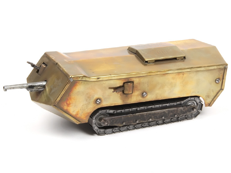 réalisation en métal - longueur : 32 cm - moteur à clef (fonctionne) - importants manques de peinture sur le canon, le carter moteur & sur les cache-galets de chenilles - une petite partie arrière de caisse désoudée