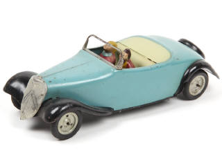 longueur 28,5 cm - avec moteur à clef (fonctionne), direction & 2 personnages en composition (quelques éclats) - quelques traces d'oxydation plus ou moins importantes par endroits - pneus craquelés - BEL ASPECT GENERAL POUR UN MODELE DE CETTE EPOQUE !