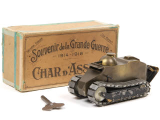 réalisation en métal - longueur : 20,5 cm - avec moteur à clef (fonctionne) & clef - importants manques de peinture le plancher & sur les cache-galets de chenilles - petites déformations par endroits - petites taches sur la boîte
