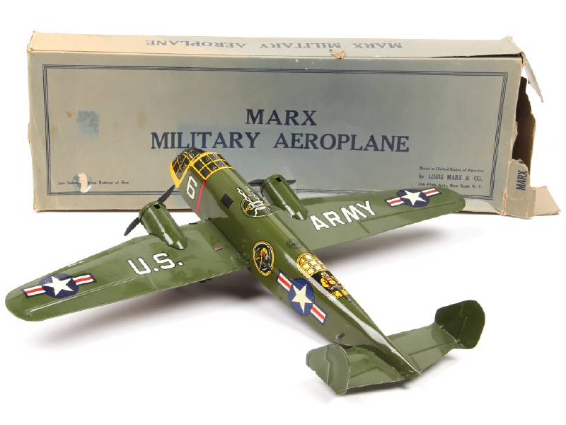 MARX TOYS (USA) Bombarbier bimoteur américain de la 2ème guerre mondiale en tôle lithographiée kaki & jaune