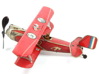 avec photographies des 2 pilotes (Costes et Bellonte) sur les ailes - envergure : 37 cm - moteur à ressort (fonctionne) - quelques petites restaurations avec retouches plus ou moins importantes par endroits (légers manques)