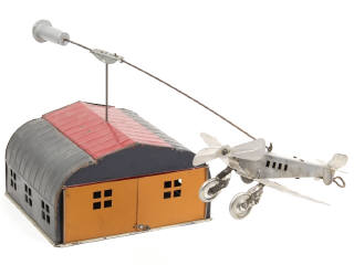 dimensions : 52 X 21 X 23 cm - moteur à ressort (fonctionne poussivement) - en action, l'avion tourne autour du hangar grace à une perche équipée d'un contrepoids (repeint) - traces d'oxydation plus ou moins importantes par endroits (principalement sous le plancher)