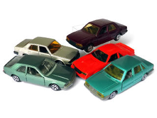 miniatures reproduisant les modèles : PEUGEOT 505, ALFA ROMEO 6, RENAULT FUEGO, TALBOT SOLARA & FORD MUSTANG