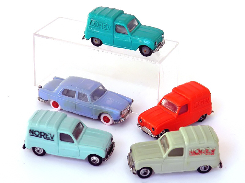 échelle 1/86ème - états de 'A' à 'B' - comprend : PEUGEOT 404 & RENAULT 4 fourgonnettes 'NOREV' (un montant de pare-brise fendu) - manque partiel de pellicule chromée - 2 modèles avec lest