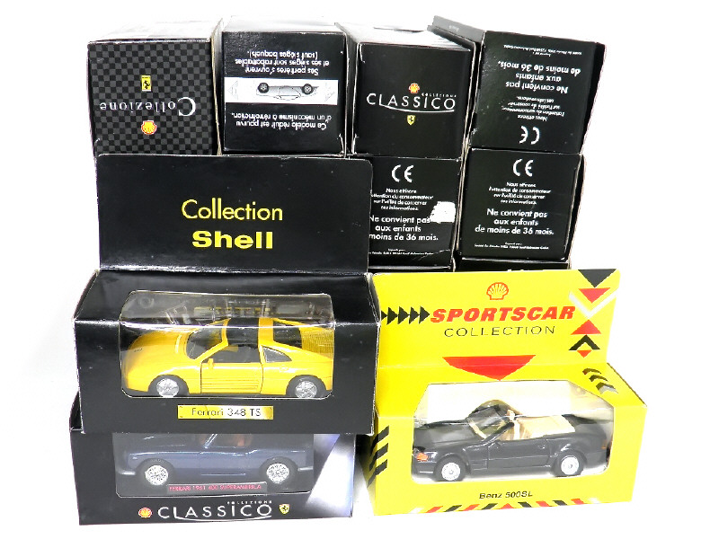 miniatures reproduisant les modèles : FERRARI, CHEVROLET, MERCEDES, ASTON MARTIN, PORSCHE, LOTUS, BUGATTI, JAGUAR & CHRYSLER - 2 boîtes états 'b'