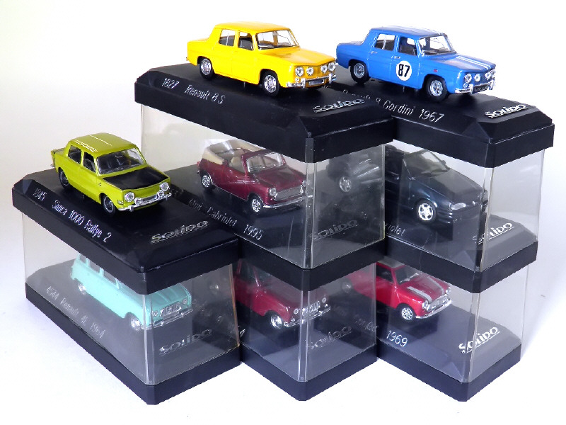 miniatures reproduisant les modèles : RENAULT 4 (2 exemplaires), RENAULT 8S, RENAULT 8 GORDINI, RENAULT 19 cabriolet, SIMCA 1000 rallye 2 & MINI (2 exemplaires)