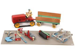 ensemble faisant parti d'un coffret agricole - comprend : une charrue trisocs, un rouleau à damer, un brise-mottes, un aérateur & une débroussailleuse - sur socle de présentation avec ficelles de maintien d'origine - quelques traces d'oxydation & parties plus ou moins ternies par endroits - RARE