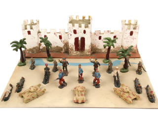 dimensions : 48 x 37 x 14 cm - réalisation en carton (légères déformations) & aluminium - comprend : 3 chars, 17 soldats avec différents uniformes & 3 palmiers - encore fixés sur le socle (légères traces d'oxydation sur les agrafes) - avec carton d'emballage d'origine - SUPERBE !