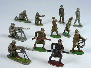 états de 'D' à 'E' - comprend : un mitrailleur, un chef de pièce, un tambour, un clairon, un grenadier, 2 soldats à la charge, 2 soldats au défilé & un chargeur - une extémité de fusil cassée - on y joint un mitrailleur de marque inconnue