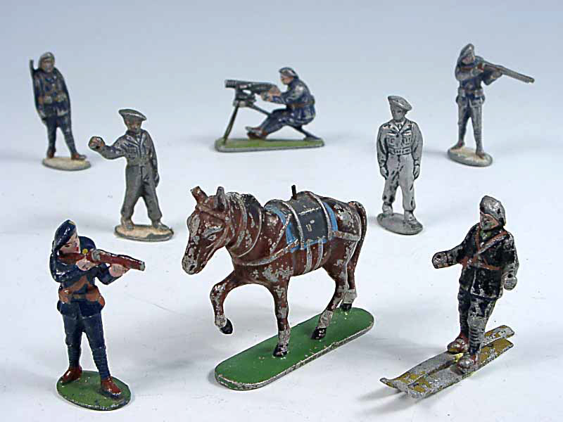 états de 'C' à 'E' - comprend : un mitrailleur, un éclaireur à skis (manque bâtons), 2 tireurs debout, un chasseur avec fusil en bandoulière, un muletier, un chasseur au défilé & une mule porte-bâts - doute sur le fabricant d'une des figurines - 2 fusils & mitrailleuses cassés