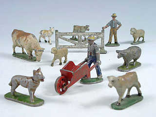états de 'D' à 'E' - comprend : une vache, un chien, un mouton, un bélier, un agneau, une chèvre, 2 veaux, une barrière & une brouette