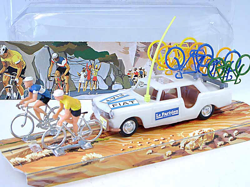 comprend : une PEUGEOT 404 porte-vélos & 2 cyclistes - avec publicités 'L'EQUIPE - LE PARISIEN - FIAT'