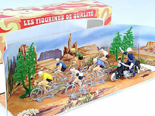 comprend : 6 cyclistes avec publicités 'SONOLOR - SCIC - KAS - SALVARANI', un motard de la police & 2 arbres