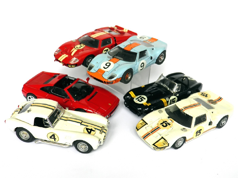 miniatures reproduisant les modèles : FERRARI, AC COBRA & FORD - on y retrouve les marques : BANG, BOX & JOUEF EVOLUTION