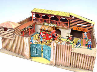 dimensions : 62 x 44 x 21 cm - manque une guérite, enseigne & quelques petits éléments - une partie du décor arrière à recoller - avec 4 personnages & 6 cavaliers - on y joint une diligence de marque inconnue