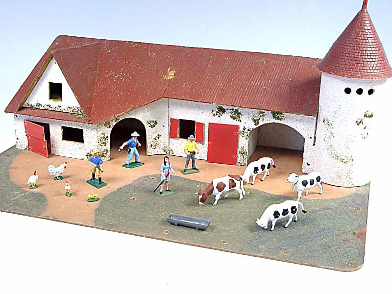 dimensions : 60 x 40 x 31 cm - manque quelques petits accessoires dont les clotures & la cheminée - on y joint 8 animaux, 4 personnages & une mangeoire