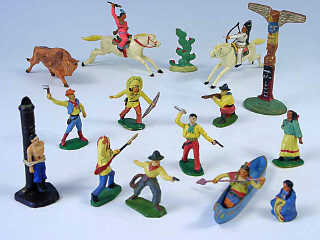 comprend : 4 cow-boys, 7 indiens dont 2 cavaliers, un poteau de torture avec son prisonnier, un cactus, un canoë & un totem