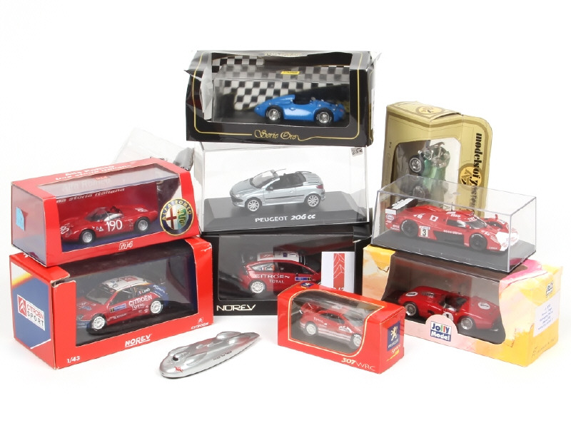 miniatures reproduisant notamment les modèles : RAILTON MOBIL SPECIAL Voiture de record de 1947 (sans boîte), ALFA ROMEO, TOYOTA, DUESENBERG, MERCEDES, CITROEN & PEUGEOT - 4 boîtes en état 'c'