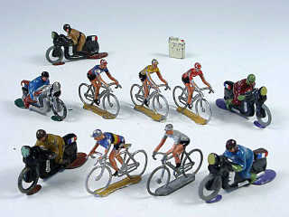 FIGURINES en fonte d'aluminium Ensemble de 5 cyclistes du tour de France, une moto & un jerrycan