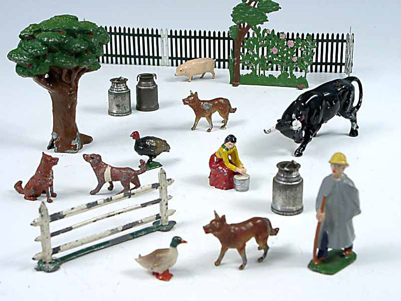 états de 'B' à 'D' - comprend : un berger, une fermière, un taureau, 4 chiens, un dindon, un canard, un cochon, une haie, un arbre, 3 pots à lait en tôle & des barrières - petit manque sur le tronc de l'arbre