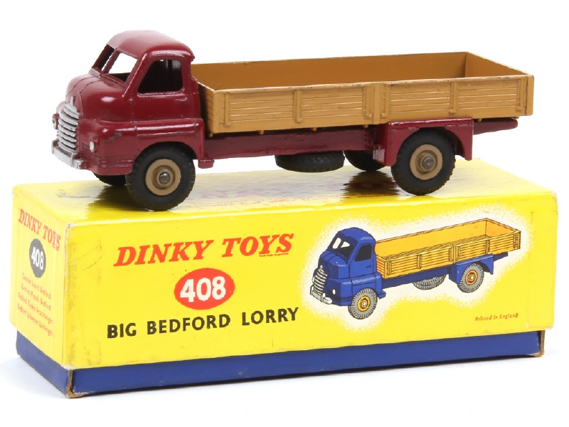 DINKY TOYS (GB) 408 BIG BEDFORD Plateau à ridelles bordeaux & ocre, jantes beiges