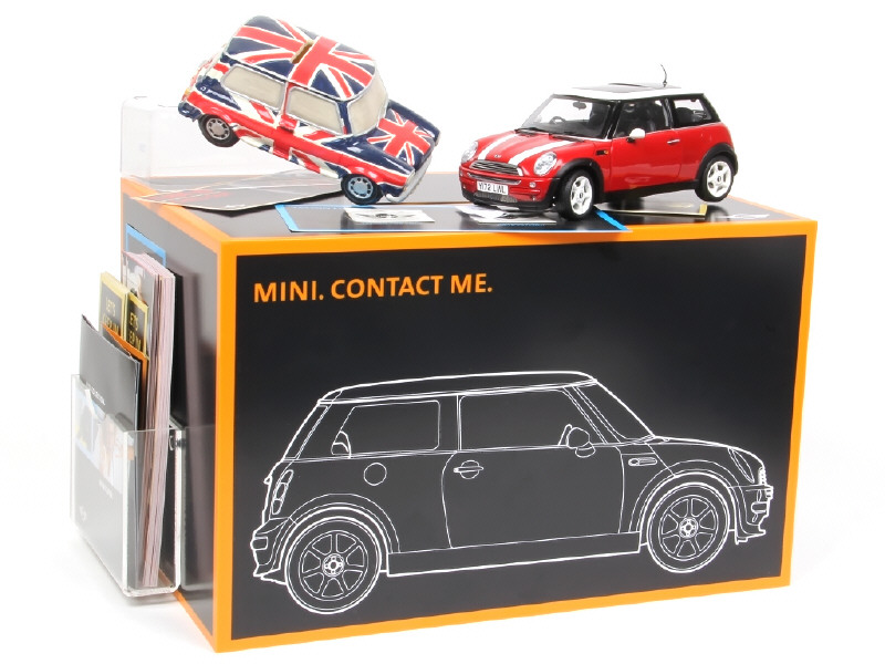 comprend : MINI tirelire (réalisation en plastique), MINI COOPER (échelle 1/18ème) de fabrication japonaise & urne en plexiglass sérigraphiée (40 x 25 x 25 cm) 'MINI.CONTACT ME'