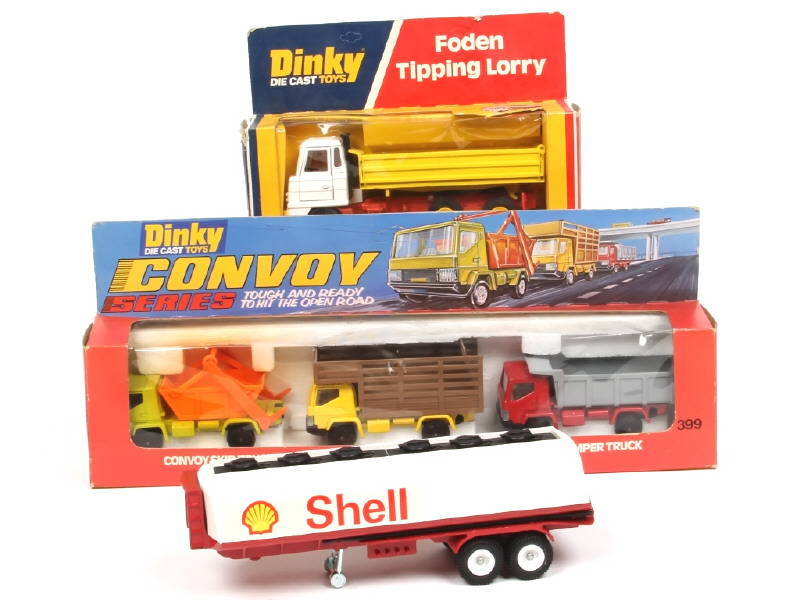 comprend : CONVOY SKIP TRUCK, FARM TRUCK, DUMPER TRUCK, FODEN TIPPING LORRY (quelques accrocs sur la boite) & FODEN TANKER (tracteur non présent sur la photo - modèle sans boite)