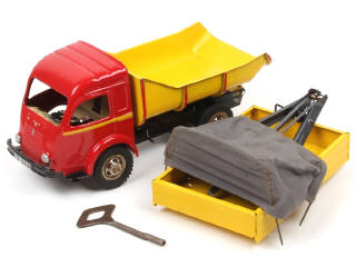 fait partie du coffret 'MULTICAMION 3 EN 1' - longueur : 32 cm - avec moteur à clef (fonctionne), clef, direction, plateau à ridelles basses, chèvre de dépannage, bâche & benne basculante - quelques petits frottements plus ou moins importants (dont un sur la portière droite : 0,5 x 0,5 mm) avec très légères traces d'oxydation par endroits - petits manques sur le décalque de tableau de bord