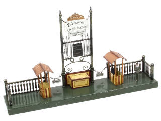 MÄRKLIN (ALLEMAGNE) Quai de gare avec panneaux indicateurs & guérites de vente de billets en tôle peinte vert, jaune & bordeaux