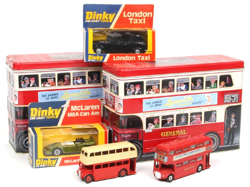 états de 'A' à 'R' - comprend : LONDON taxi, MAC LAREN M8A CAN AM & ROUTEMASTER BUS (2 exemplaires) - on y joint 2 boites à biscuits vides en tôle de fabrication récente