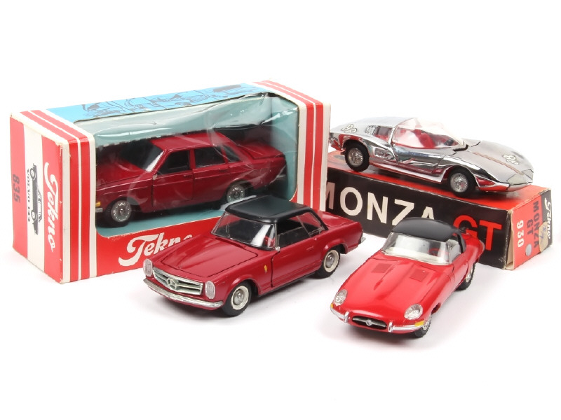 états de 'A' à 'B' - comprend : VOLVO 144, MONZA GT, JAGUAR type E & MERCEDES 280 SL - on y retrouve les marques : TEKNO & KIRK - 2 exemplaires en boite (état 'b' avec petits accrocs)