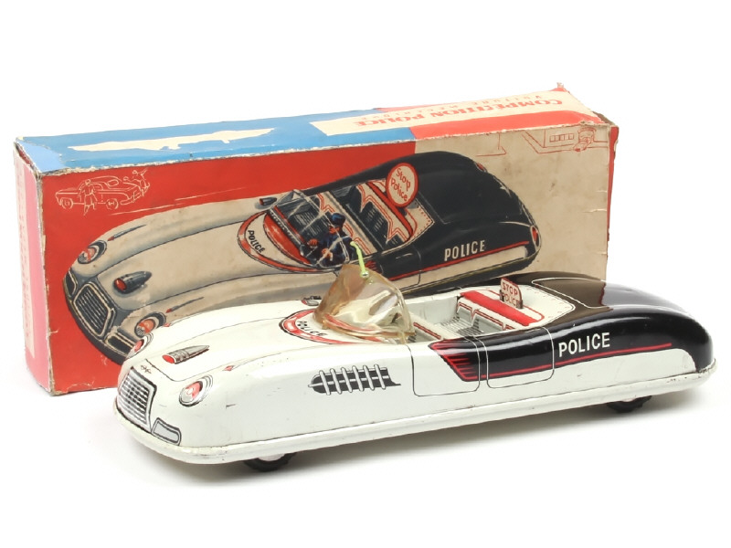 longueur : 33 cm - avec moteur à friction & bruiteur (fonctionnent) - pare-brise très légèrement déformé avec petites fêlures par endroits - parties de boîte non d'origine