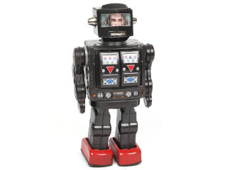 hauteur 29,5 cm - moteur à piles (fonctionne au niveau des mitrailleuses & de la rotation mais la marche est aléatoire) - en action, son torse s'ouvre laissant apparaître des armes à feux lumineux - avec bruiteur - quelques traces d'oxydation plus ou moins importantes sur l'ensemble du modèle