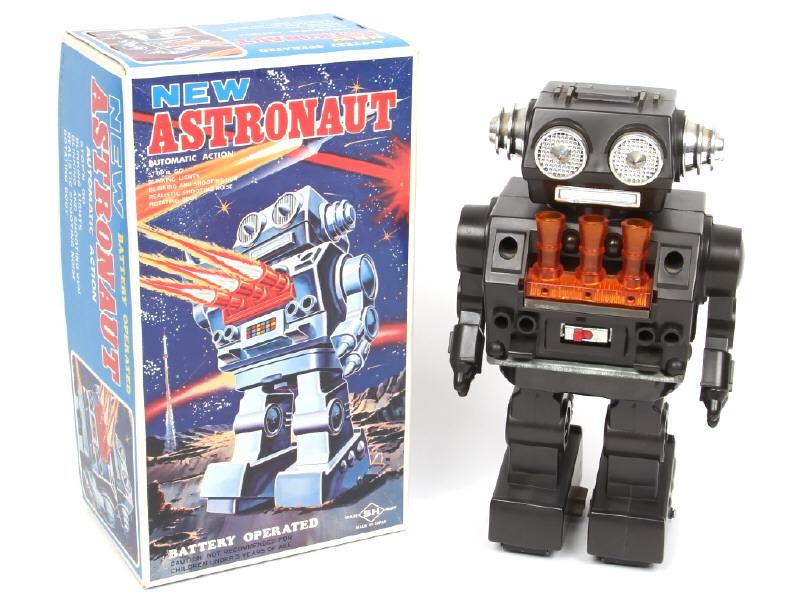 hauteur 23,5 cm - moteur à piles (fonctionne) - en action, le robot avance, s'arrête & tourne sur lui même en tirant (bruiteur & lumière) - quelques frottements & très légères traces d'oxydation