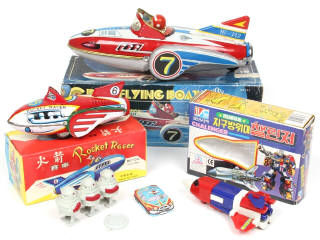 différentes échelles - comprend : ROCKET RACER, petite boite-voiture en métal, jouet marcheur avec 3 astronautes, NAVIRE AERIEN & NAVETTE CHALLENGER - on y retrouve notamment les marques : MF & GLOBO - quelques légères traces d'oxydation & rayures - 2 moteurs à friction (fonctionnent)