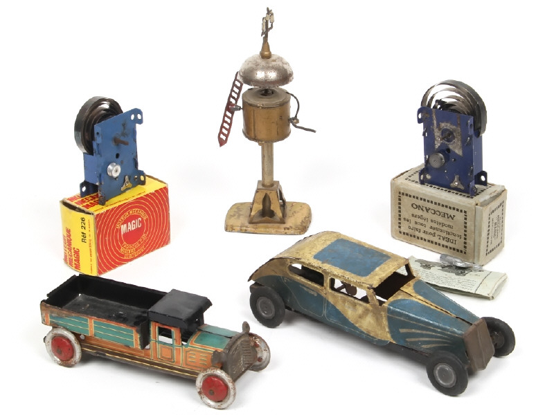 états de 'D' à 'F' - comprend : 2 voitures en tôle, 2 moteurs MECCANO en boites (état 'd' - fonctionnent - avec une clé & notice) & un accessoire de machine à vapeur - oxydation plus ou moins importante - on y retrouve notamment les marques ML & GL